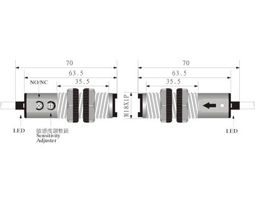1. Method of detection: through beam type 2. Detecting distance: 10M;20M 3. Output: NPN NO/NC, PNP NO/NC 4. Power supply: DC 10 ~ 30V 5. Wiring material: PVC oil resistance 6. Degree of protection: IP66
